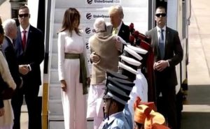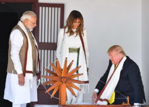 Prime Minister Narendra Modi received US President Donald Trump, First Lady Melania Trump, Ivanka Trump and Jared Kushner with a warm welcome at Ahmedabad International Airport on Monday at 11. 50 am. The cultural teams performed the dances and folk songs at the airport. Prime Minister Narendra Modi hugged Trump at the airport and they proceed towards Motera Stadium, on the mid way President Donald Trump and his family visited Sabarmati Ashram and spun the charka. PM Modi explained the significance of the traditional spinning wheel to the visitors. He was seen showing the Trumps around the revered ashram and explaining the marble depiction of Gandhi’s three monkeys to Melania Trump.