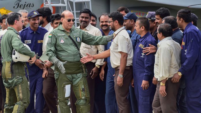 Bengaluru: Union Defence Minister Rajnath Singh travelled in a light combat aircraft plane on Thursday in Bengaluru. The light combat aircraft “Teja’s” manufactured with the local technology. Rajnath singh travelled in Teja’s along with air-vice marshal N. Tiwari nearly 30 minutes.